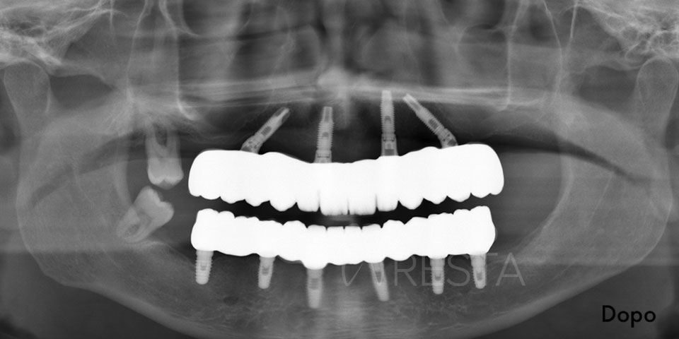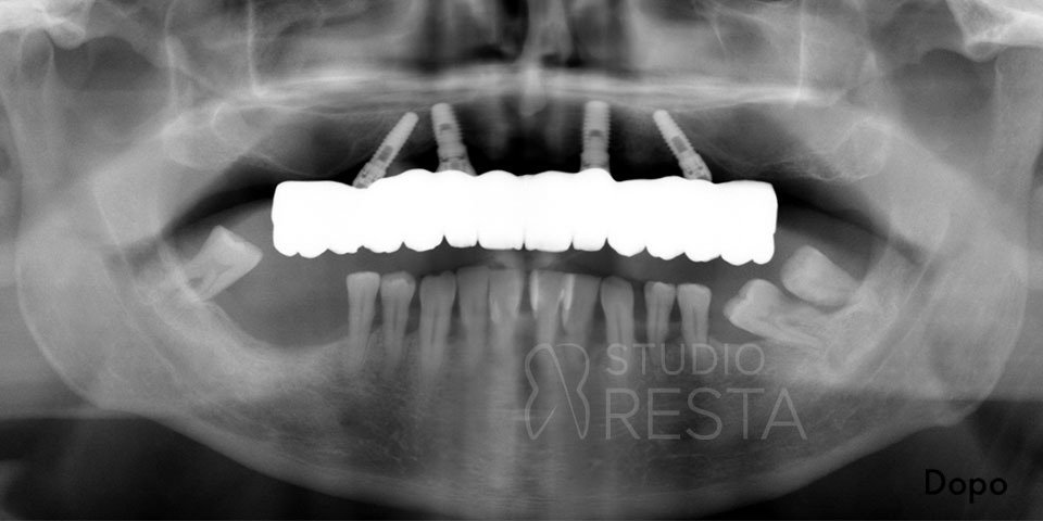 - Controllo radiografico finale: a completamento dell’intervento, eseguiamo una radiografia di controllo (OPT) per verificare l’esatto posizionamento dei quattro impianti. Spesso si noterà che i due impianti posteriori sono inclinati verso la parte posteriore dell’arcata (tilted implants), confermando il caratteristico assetto “a V rovesciata” dell’All on 4.